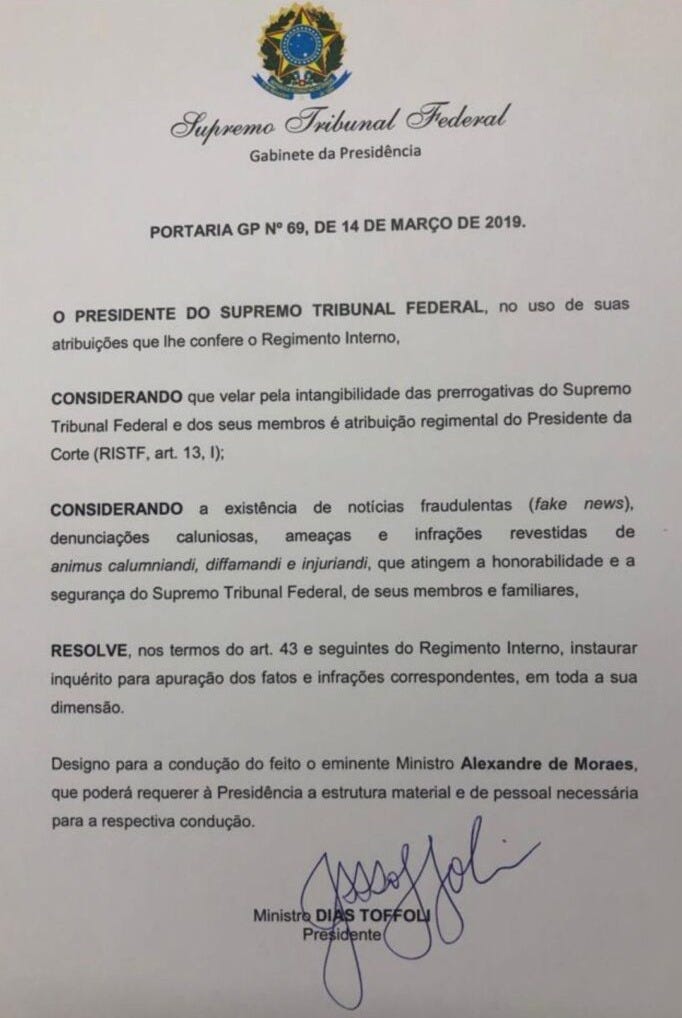 Era um abuso do Artigo 43 do Regimento Interno do Supremo Tribunal Federal, que prevê inquéritos abertos de ofício somente no caso de crimes cometidos nas dependências da corte. A internet e o debate público brasileiro, agora, eram um puxadinho do STF.